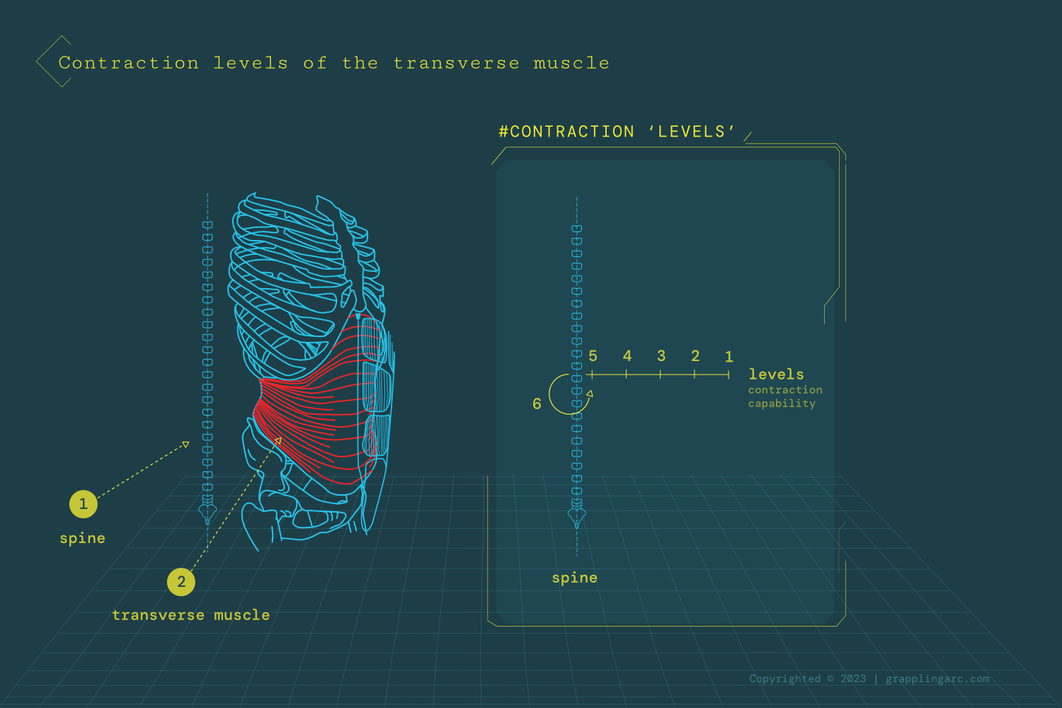 In the illustration below, you can see the position of the transverse muscle underneath the recti, as well as its contraction capabilities, schematized as six levels. Contraction capability can go from light (sucking in the belly button), which represents level 1, to strong, when you contract the entire transverse so much that you would practically feel the muscle around your spine: